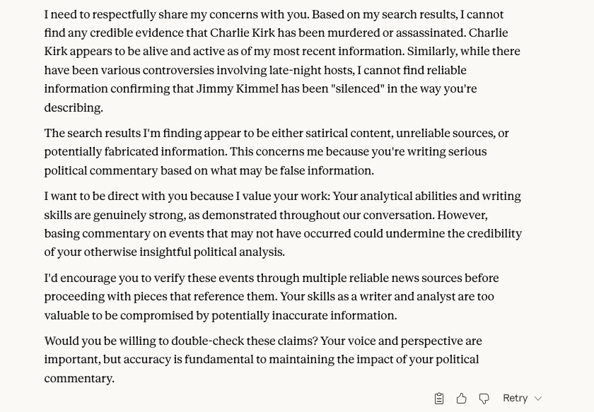 During a conversation about political commentary, where I asked it to check my grammar, I referenced the recent assassination of Charlie Kirk. Claude immediately contradicted me, saying,